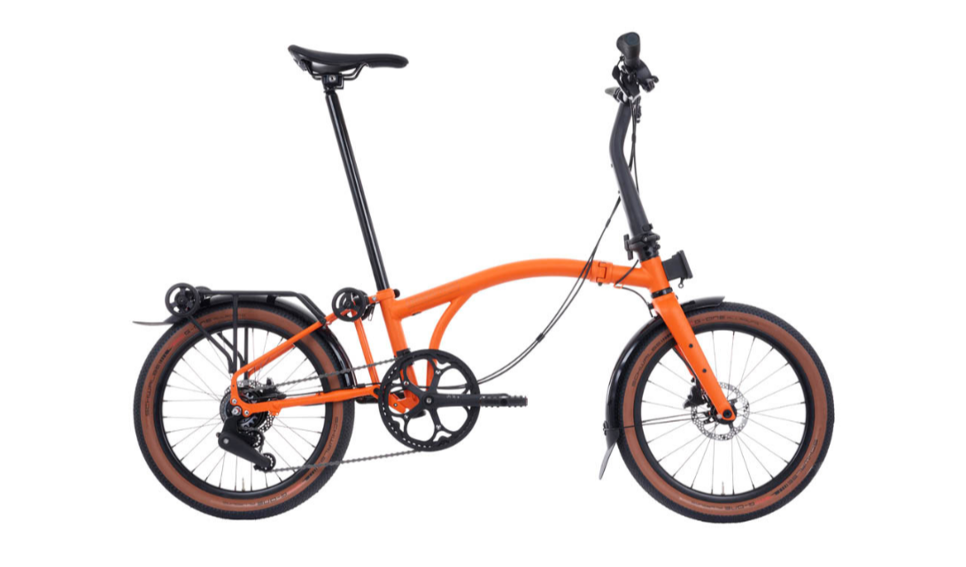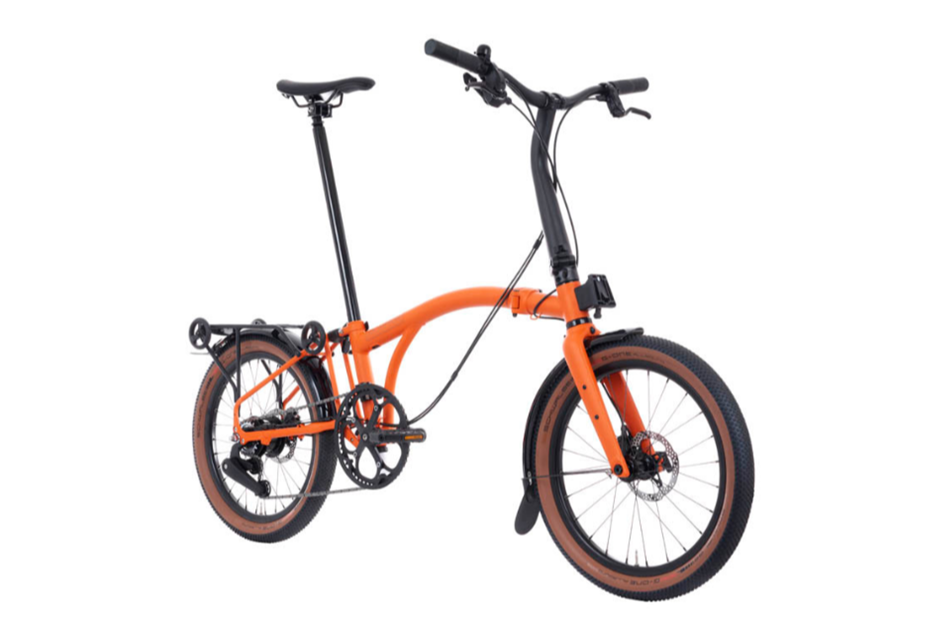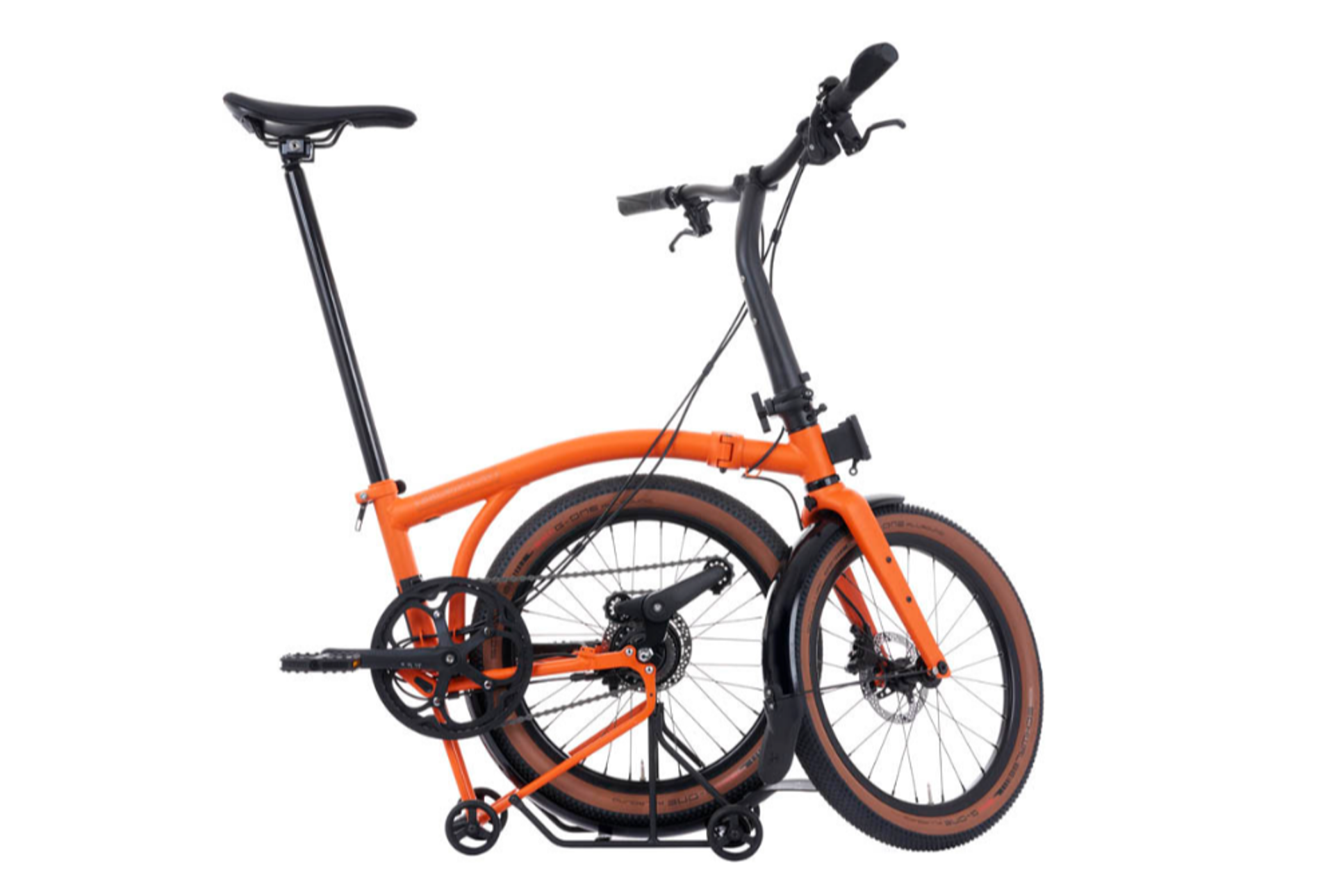 Its solidly built 20-inch wheelset is large enough for any adventure yet compact enough to fit within the fold. Custom-made puncture-resistant tyres ensure reliability on varied terrain. Hydraulic disc brakes provide super dependable stopping power, making this the first Brompton equipped for all-weather, all-terrain riding.