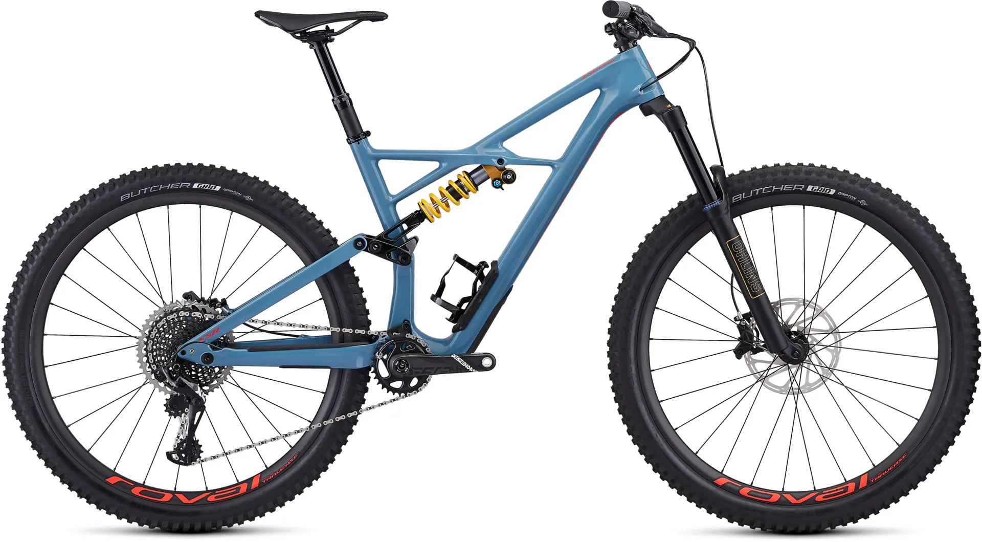 For the build this enduro strikes at the pinnacle of performance with a full SRAM x01 eagle 12-speed groupset powerful SRAM code r brakes stupid-fast Roval carbon wheels a command post ircc dropper post and an hlins rxf 36 fork up front.