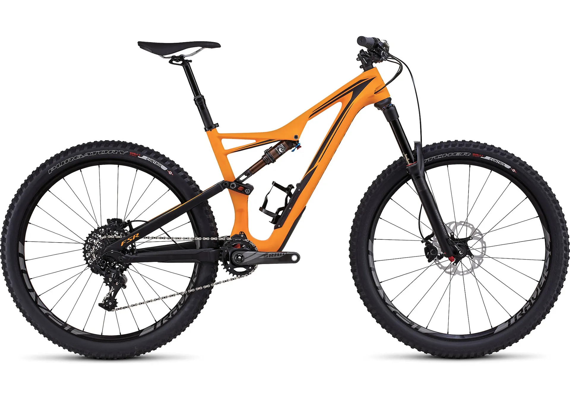 If your idea of trail riding follows the philosophy of "go big or go home," you simply can't beat the agility and responsiveness that a 650b provides. Knowing this, we built our Stumpjumper FSR Expert Carbon 650b to be the ultimate all-rounder trail bike. It features SRAM's workhorse one-by groupset, X1, and Shimano's dependable, no-holds-barred XT hydraulic disc brakes to round out a build that places an equal focus on durability and efficiency. At the frame, you'll find our FACT 9m carbon fibre that creates a lightweight, strong, and stiff construction. The carbon moulding process also allowed us to revolutionize how you carry your trail essentials with the all-new SWAT Door found at the down tube. This compartment will fit a tube, a tool, and pump without rattling or compromising the structural integrity of the frame. And when you factor in our proprietary Rx Trail Tune at the shock, plus an aggressive, trail-eating geometry that features ridiculously short chainstays, a roomy top tube, a low bottom bracket, and a slacked out front end, you truly do get a bike that refuses to compromise.